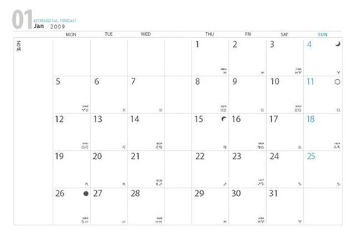 咳 咳,2009運勢就像過去唐老師所出的書一樣,字多到嚇死你,大家可以慢慢讀、讀個過癮;日誌則是今年第一次開發的商品,延續去年的月亮日觀察,加上每天 的行星相位,文字方面則提醒當周星象氛圍,並非預測,每月開頭還有我親自手繪的當月星圖,內頁設計則是顧慮到大家安排行程的需要,左邊記錄事件,右邊則是 空白頁讓大家記錄隨筆與人名電話等,是一本很實用的年度日誌本,也是今年以唐立淇為品牌第一次開發的商品,如果大家覺得還不錯,也很好用,唐老師就有勇氣 繼續為大家推出更多更漂亮又實用的星曆筆記本囉,呵呵。